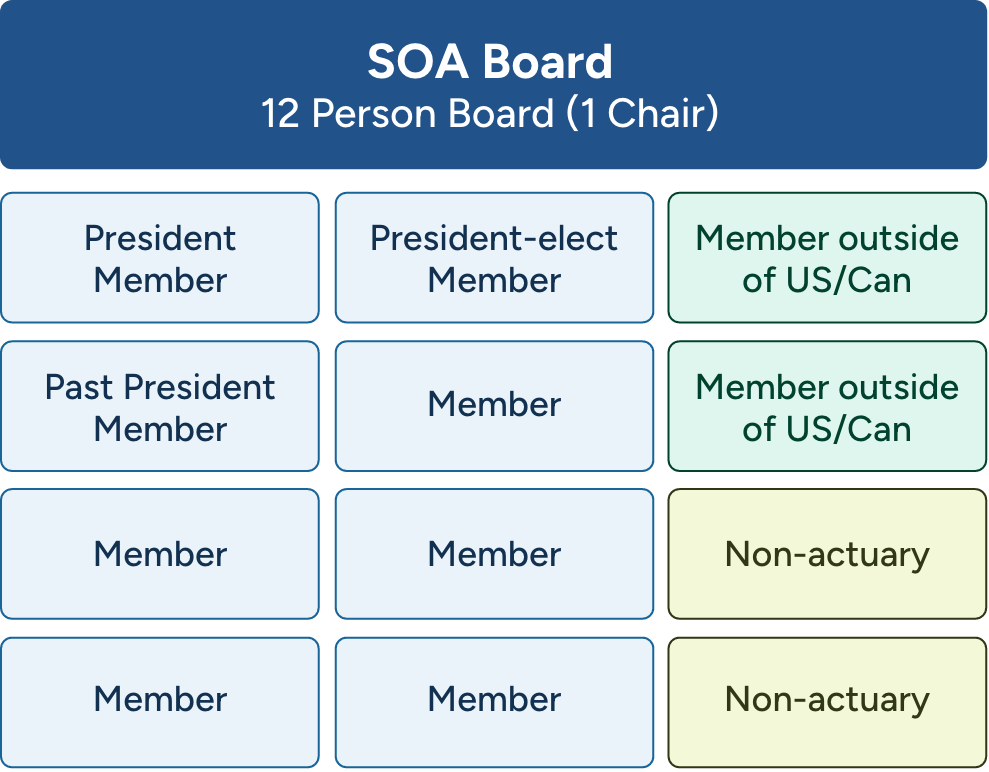 Diversity can be achieved in many ways, and a larger Board does not necessarily ensure it. For example, the current Board does not reflect the diversity of our membership. While 20% of members reside outside the U.S. and Canada, we typically only have 1 or 2 Board members from other markets. The Board generally has more U.S. members, consultants, retirees, and members practicing in life insurance than are represented in the member population. There are also no ASAs who have been members for 5 years or more on the Board, but they make up 30% of our membership. Reducing the Board size, combined with a more intentional skills- and experience-based evaluation process, can create a more diverse Board, with fewer members.