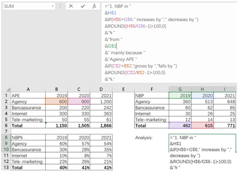 A spreadsheet is a geographic map made of columns and rows. Data are stored in geographic cells. When we refer to a piece of data, we do not do so directly on the data. We actually refer to the cells where the data sit. For example, when we calculate NBP%, we cannot directly type a formula “NBP%=NBP/APE.” Instead, we have to translate the formula into a geographic reference and type “=G2/B2” to get the Agency NBP% in 2019. Such mental translation is done manually and can hardly be automated. This means a loss in efficiency.