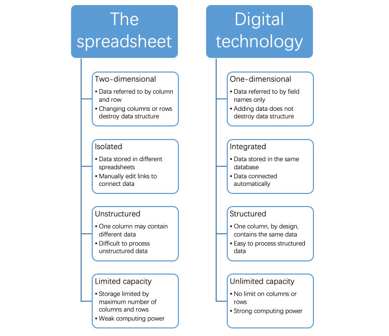 Data are stored in different spreadsheets. We need to manually edit links to connect them. Such an isolated manner decreases efficiency and prevents us from benefiting from big data.