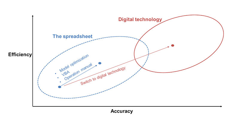 Therefore, we see how the spreadsheet is hindered by its own design for higher efficiency. Though we may improve efficiency through model optimization, VBA, and a well-written operation manual within the spreadsheet paradigm, the improvement is modular at best. We will make a quantum leap if we make a paradigm shift to digital technology. The effect is akin to upgrading from a car to an airplane.