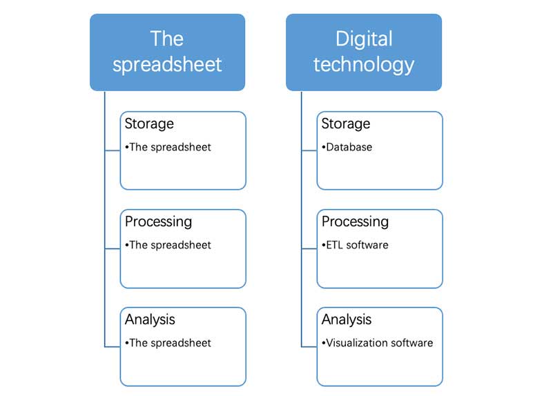 As one of the standard digitalization initiatives, we have seen big data, data science, artificial intelligence (AI), and machine learning departments set up in many companies. While these new departments are using new-generation digital technology such as the database, ETL software, visualization software, etc., the rest of the firm (the actuarial, finance, operations departments and so forth) are still working with old-school technology like the spreadsheet. Thus, a dichotomy is created in a firm where senior managers are using smart phones (modern technology) to view reports produced with old-school technology. A problem arises when a senior manager, used to modern technology, wants an instant response but is told to wait for a few days. We know in this fast-changing competitive world, a few days might mean lost opportunities worth millions of dollars. Therefore, in order to improve efficiency and fulfil the ever-higher management and regulatory demand, we must abandon the spreadsheet and go digital.