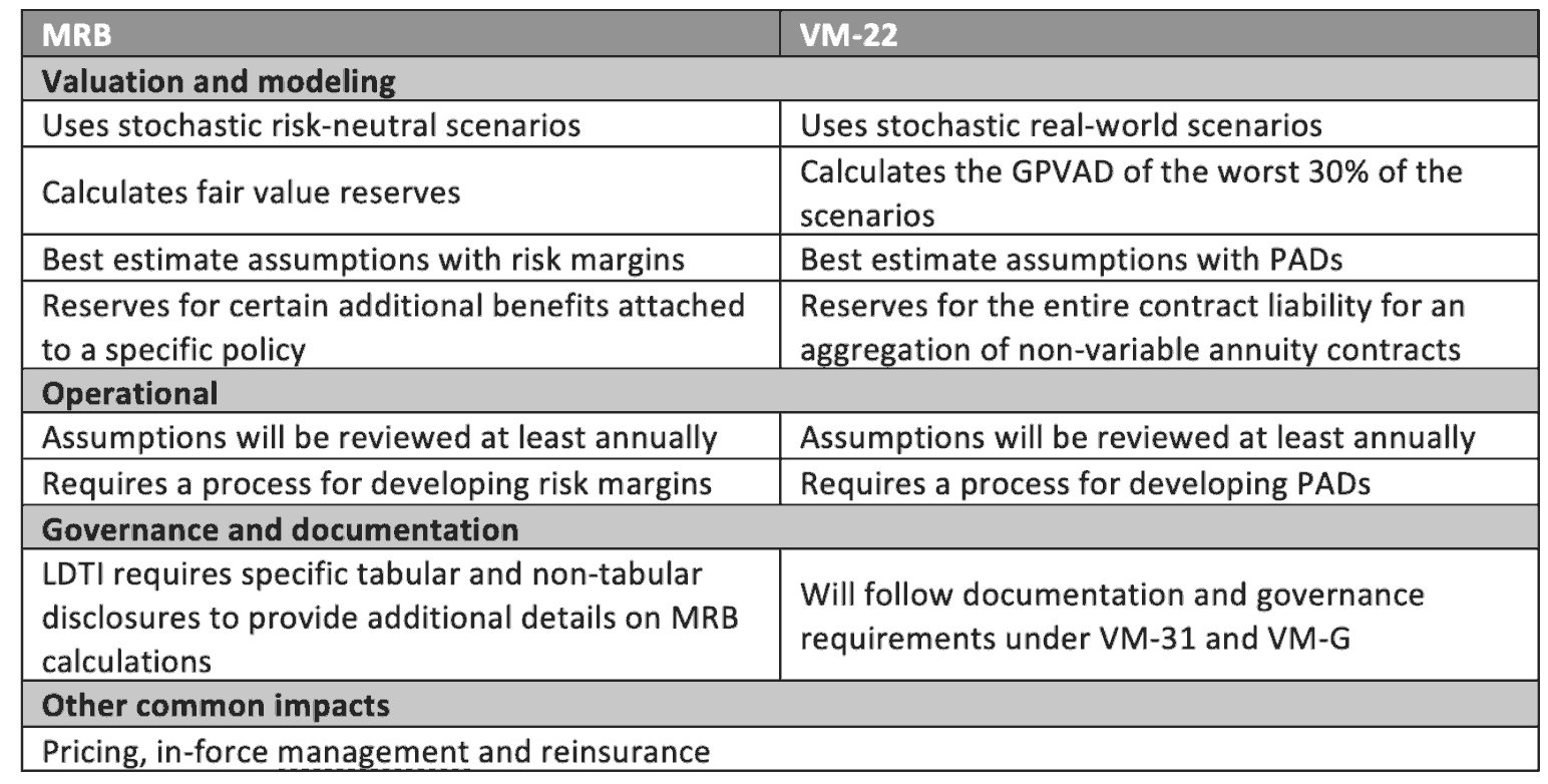 With the experience gained from the recent public company LDTI implementation, we wanted to compare the proposed VM-22 regulation to MRBs. (See Table 1)
