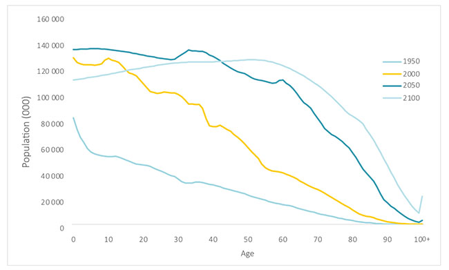 Past and projected future global population distributions by age are shown in Figure 1. The global population is expected to grow from 2.5 billion in 1950 to 10.3 billion in 2100. Lower fertility rates and greater longevity result in a higher percentage of elderly persons in the total population as the century progresses. Specifically, note that the curve for 2100 is below the 2050 curve before age 40. UN population projections have limitations but provide a reasonable place to start a discussion about demographics and productivity growth.